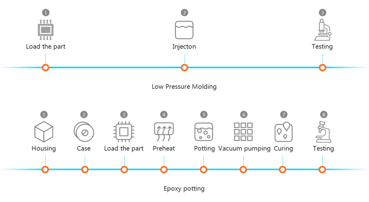 Low Pressure Molding with PA hot-melt materials is a process typically used to encapsulate and environmentally protect electronic components. The purpose is to protect electronics against moisture, dust dirt and vibration.